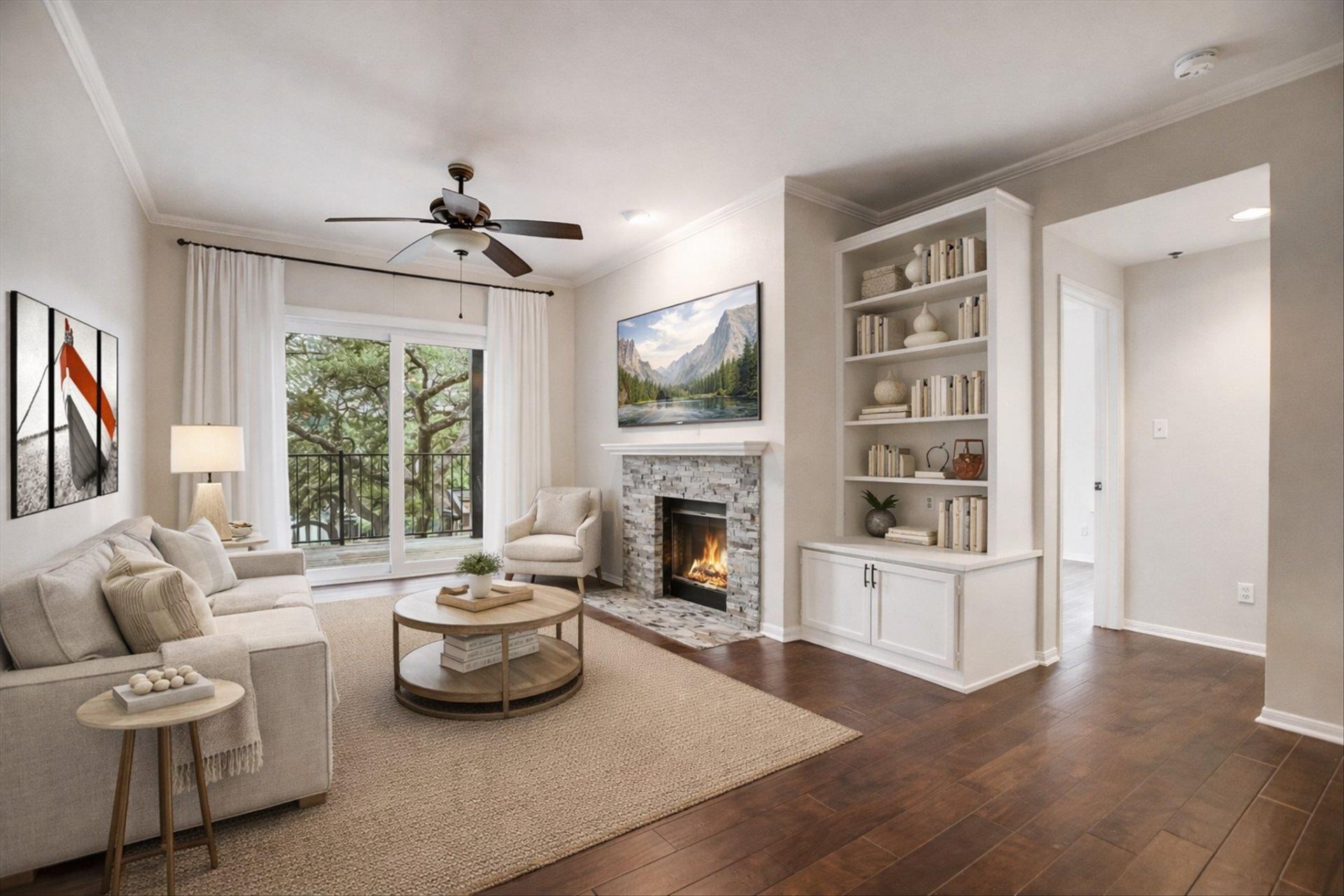 Walk to the Greenbelt in the heart of Central Austin! This one-story condo at ground level has two bedrooms, two full baths, and backs to the Spyglass Trailhead at Barton Creek. Located in Eanes ISD, the unit is fully equipped with built-in bookshelves, wet bar, fireplace, a tranquil balcony and washer/dryer combination conveyed with sale. This gated, tree-lined community features google fiber, an onsite pool and hot tub and includes 1 reserved carport space with ample visitor parking. Set against the stunning backdrop of the Barton Creek Greenbelt, with sweeping views of downtown and Zilker Park, this home offers both tranquility and convenience. A cozy double-sided fireplace anchors the living area and the primary suite, adding warmth and charm. The kitchen features composite stone countertops, abundant pantry storage, and a greenhouse window for growing herbs. HOA covers water, wastewater, trash, and exterior maintenance. You're just steps from Metro bus stops and a quick hop to downtown, Zilker Park, and South Lamar. Don't miss this treasure in an unbeatable location!